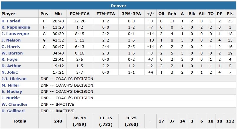 OKC a shooté à 57.8% (meilleur pourcentage de la saison) pour faire face aux 25 points et 11 rebonds de Kenneth Faried, qui tentait d’éviter une 5e défaite en 6 maths aux Nuggets, en vain. Joffrey Lauvergne était également bien présent dans la raquette de Denver avec 18 points à 8/15 et 4 rebonds pour lui en 30 minutes de jeu. Comme contre Chicago, le Thunder démarre doucement et se retrouve mené 61-53 à la pause. Kostas Papanikolaou rentre un 3-points pour démarrer la 2e mi-temps et les Nuggets prennent 11 points d’avance. Le Thunder répond par un 20-9 porté par Westbrook et Durant pour égaliser à 73 partout à 5’07. Le score reste ensuite serré et Denver mènera au score pour la dernière fois du match sur un panier de Randy Foye à 8’13, 97-96.