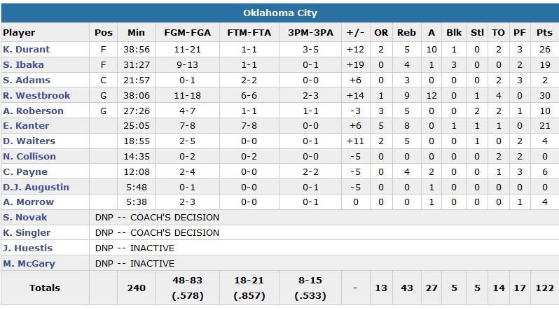 Le Turc sorti du banc a « clairement » été le MVP du Thunder sur ce match selon le coach de Denver, Mike Malone. Il inscrit 11 de ses 21 points en l’espace de 5 minutes marquées par deux gros dunks pour booster les siens au meilleur des moments. Westbrook lui, passe à un rebond de son 4e triple-double de la saison. Quant à Durant, il enregistre son 8e double-double de la saison. Le Thunder (vainqueur de 10 de ses 12 derniers matchs) était mené de 11 points en seconde mi-temps avant de revenir au score.