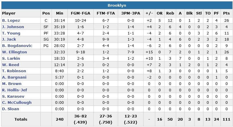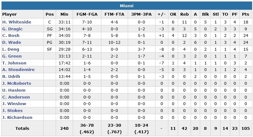 Miami inscrit les 2 premiers points de la seconde mi-temps et tient une bonne avance, 60-44. Mais à la fin de la période, les Floridiens se retrouvent menés au score après avoir encaissé un 32-14. Ellington rentre ensuite son 7e tir primé de la soirée à 1’11 de la fin du match pour donner 10 points d’avance aux siens, 103-93. Miami se rapproche à 4 points sur un dunk de Wade à 41 secondes mais n’ira pas plus loin. Brooklyn a battu ses records en saison au niveau des 3-points (12) et lancers-francs dans ce match (27).