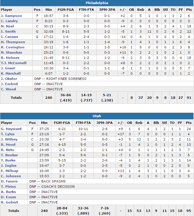 Gordon Hayward a scoré 24 points (à seulement 6/21) dont le panier à trois points qui a permis au Jazz de passer en tête pour de bon à 33.5 secondes de la fin et de s’imposer face aux Sixers 95-91. Le Jazz interrompt une série de deux défaites malgré les absences de Rudy Gobert, Derrick Favors et Alec Burks. Utah a désormais un bilan de 13-16.