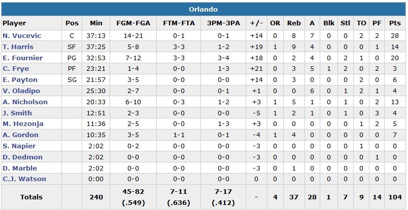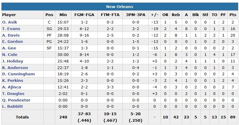 Tobias Harris et Andrew Nicholson se joignent à la fête avec 14 et 13 points pour Orlando, qui a usé de plusieurs runs en début de 3e quart-temps et dans le 4e quart-temps pour progressivement se détacher. Anthony Davis joue 28 minutes pour 20 points à 9/16 et 8 rebonds et est accompagné par les 17 points de Norris Cole et les 16 points et 8 passes de Tyreke Evans.