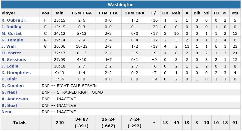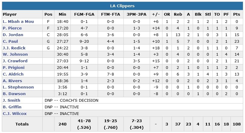 Les Clippers ont toujours mené dans ce match, en comptant au moins 10 points d’avance tout au long des 3 derniers quarts-temps. Les 23 points et 11 passes de John Wall et 12 points et 16 rebonds de Marcin Gortat n’ont pas suffi aux Wizards, qui voient leur série de 4 victoires stoppée, malgré 21 points d’Otto Porter en sortie de banc pour pallier à l’absence de Bradley Beal, Nene, Gary Neal et Drew Gooden. Los Angeles démarre son match sur un 21-6 sans appel marqué par un premier dunk de Chris Paul (2 sur la rencontre, même s’il a du mal à accrocher le cercle sur le 2e, où il obtient le and one alors que le score est de 53-34).
