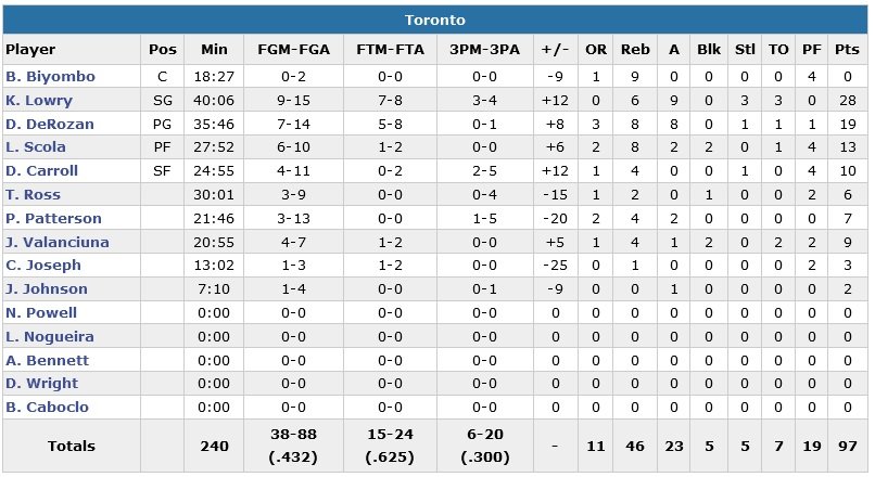 Aaron Brooks et Bobby Portis ajoutent respectivement 17 et 12 points alors que le banc des Bulls a dominé celui des Raptors 51-27. Kyle Lowry mène les Raptors avec 28 points (9/15, 6 rebonds, 9 passes), DeMar DeRozan suit avec 19 points alors que Jonas Valanciunas a effectué son retour (17 matchs d’absence en raison d’une main gauche fracturée) pour 9 points en 20 minutes.