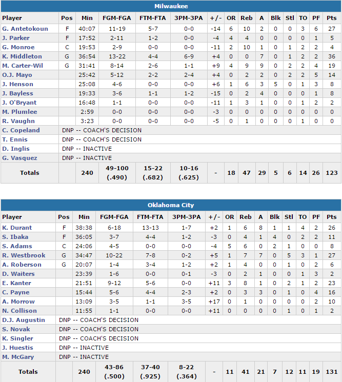 Kevin Durant (26 points à 6/18, 6 rebonds et 8 passes), Russell Westbrook (27 points à 10/22, 7 rebonds, 7 passes et 5 interceptions) ont comme d’habitude fait le boulot, avec l’aide très précieuse d’Enes Kanter (23 points à 9/12 et 8 rebonds en 22 minutes). Anthony Morrow a lui aussi été important avec deux tirs à trois points dans le dernier quart pour un total de 10 points. OKC a shooté à 50% dont un magnifique 37/40 aux lancers francs. Cela leur a permis de résister aux 36 points à 13/22 de Khris Middleton et aux 27 points à 11/19 et 10 rebonds de Giannis Antetokounmpo. Michael Carter-Williams a lui ajouter 19 unités à 8/14, 9 rebonds et 9 passes.