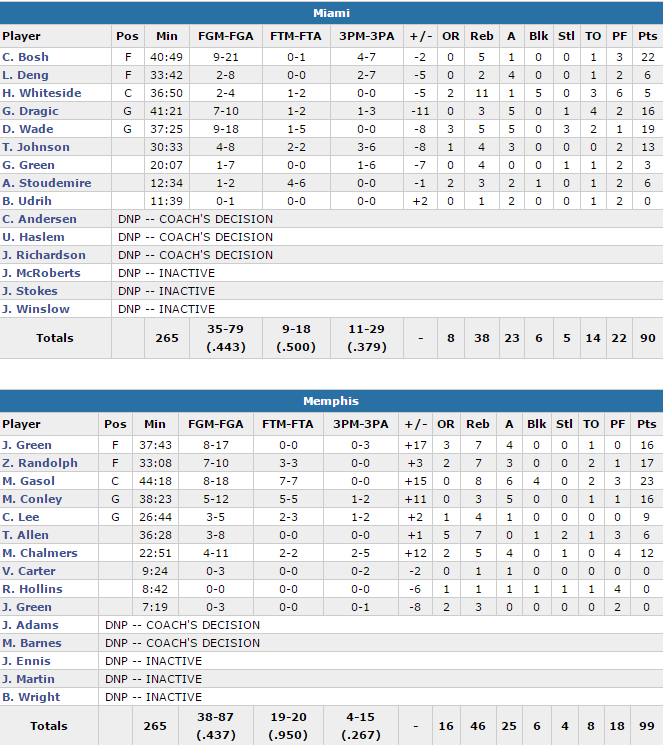 Marc Gasol a scoré 7 de ses 23 points (8/18, 8 rebonds, 6 passes et 4 contres) dans le temps supplémentaire. Zach Randolph a signé 17 points à 7/10 et 7 rebonds alors que Mike Conley et Jeff Green ajoutent 16 points chacun et Mario Chalmers 12 unités
