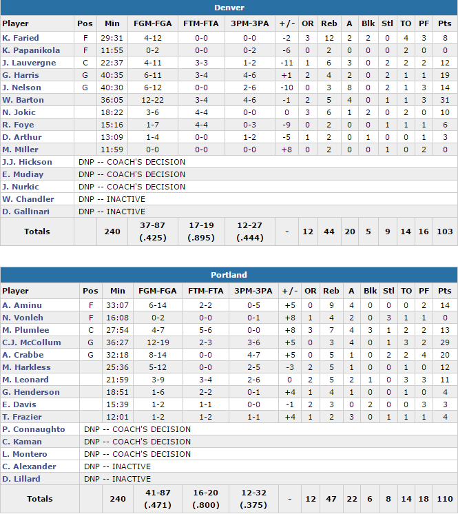 Après 12 premières minutes équilibrées, Portland a appuyé sur l’accélérateur en début de second acte sous l’impulsion de leur second 5. Ils ont débuté par un 13-2 qui leur a donnés 10 points d’avance. Denver a recollé à trois points, notamment grâce à Lauvergne, mais CJ MCollum a fini fort pour un score de 58-51 à la pause. Le coup de chaud de Crabbe à trois points en troisième quart a permis aux Blazers de s’envoler avec un score de 81-65. A 8 minutes de la fin du match, l’écart était toujours de 16 points (96-80) et Denver a tenté un dernier run, avec un 11-0 sous l’impulsion de Barton et Jameer Nelson, mais McCollum et Crabbe ont plié le match à longue distance.