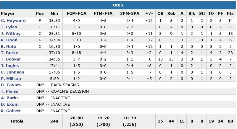 Gordon Hayward inscrit 14 points sur seulement 9 tirs pour Utah (19 ballons perdus, 35% aux tirs et 10/39 à 3-points), Trevor Booker gobe 15 rebonds et Jeff Withey signe 13 points et 9 rebonds alors que Trey Burke marque la totalité de ses 23 points en seconde mi-temps. Déjà privé de Rudy Gobert, Dante Exum et Alec Burks, Quin Snyder a de moins en moins d’options disponibles et il s’est tourné vers Raul Neto à la mène, Withey en poste 5 et Trey Lyles en 4 dans ce match.