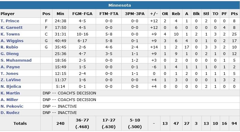 Gros match du n°1 de la draft cette nuit avec 25 points (dont 12 dans le dernier quart-temps) à 10/16, 10 rebonds et 2 contres mais surtout une victoire dont son équipe avait bien besoin après 4 revers consécutifs. Ricky Rubio égale lui son record de passes en carrière (17) et les Wolves s’imposent 94-80.