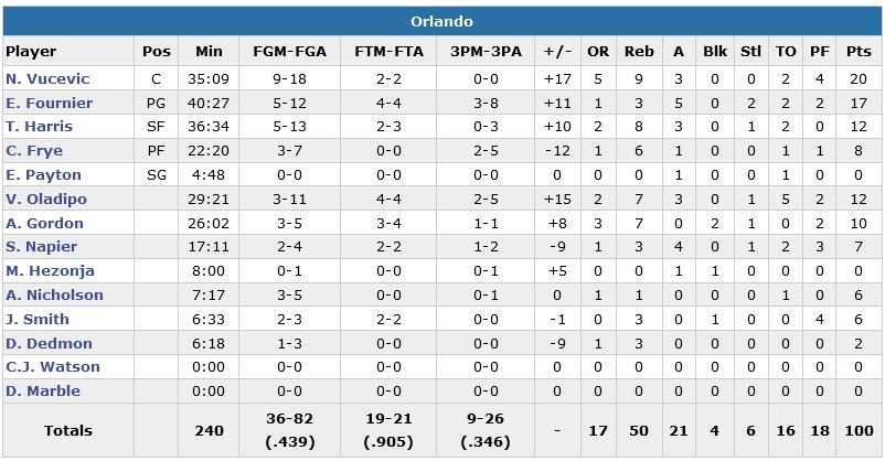 Menés au score pendant une bonne partie de la seconde mi-temps, Orlando passe un 9-0 à ses adversaires en fin de 3e quart avant de dominer les 12 dernières minutes 32-20. Brooklyn encore devant 93-90, Vucevic puis Tobias Harris enchaînent un layup chacun pour passer devant 94-93 à 45 secondes du buzzer final. Les Nets ne parviennent pas à trouver un shoot ouvert et Jarrett Jack manque sa chance à environ 6m derrière. Victor Oladipo rentre 2 lancers-francs de l’autre côté puis Brooklyn perd le ballon de la dernière chance quand uen faute offensive est sifflée à Brook Lopez.