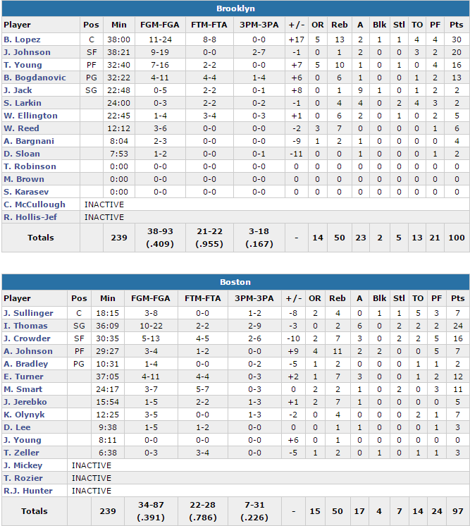 Brook Lopez (30 points à 11/24 et 13 rebonds) et Joe Johnson (20 points à 9/19) ont été les grands artisans de la victoire des Nets, qui s’est dessinée en seconde mi-temps même s’ils ont été devant une très grande partie de la rencontre. Thaddeus Young (16 points et 10 rebonds) et Bojan Bogdanovic ont été également précieux dans ce succès.
