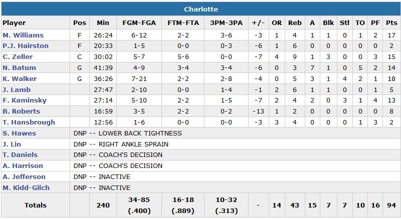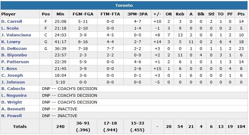Devant 82-74 avant de jouer les 12 dernières minutes, Charlotte va perdre son avantage pour la première fois depuis le deuxième quart-temps sur un 3-points de Lowry à 8’30. Les deux équipes à égalité 94 partout 4 minutes plus tard, les Raptors vont inscrire les 10 derniers points du match avec notamment deux 3-points consécutifs signés Lowry puis DeMarre Carroll. Les Hornets ratent leurs 8 derniers shoots de la période et terminent à un ignoble 19% de réussite dans le 4e quart.