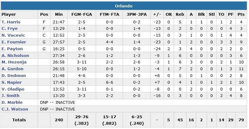 Les titulaires du Magic sont limités à 20 points combinés avec 11 unités. Aaron Gordon est meilleur marqueur de son équipe avec 11 points seulement. Mario Hezonja et Shabazz Napier suivent avec 10 points tandis qu’Evan Fournier est le meilleur scoreur parmi les starters avec 9 points à 2/5, 1 rebond et 2 passes en 28 minutes.