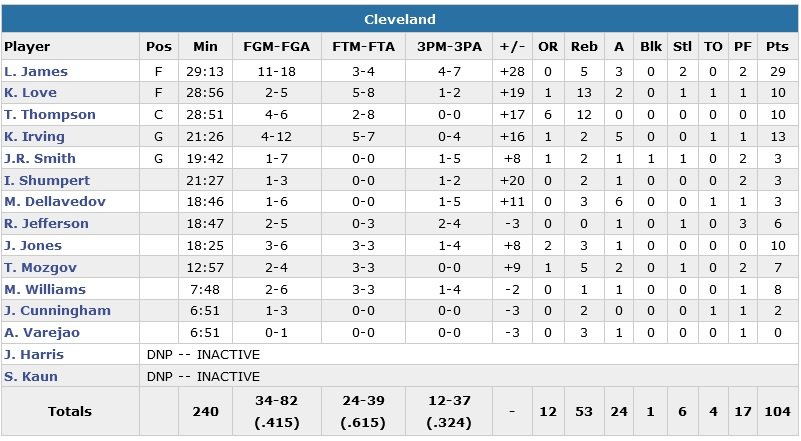 Kevin Love et Tristan Thompson sont en double-double avec respectivement 10 points à 2/5 et 13 rebonds et 10 points à 4/6 et 12 rebonds (dont 6 offensifs). Pour son 6e match depuis son retour, Kyrie Irving signe 13 points à 4/12, 2 rebonds et 5 passes en 21 minutes. Scott Skiles a eu besoin d’un temps-mort après seulement 5 minutes de jeu puisque Orlando est rapidement mené 19-4, puis 29-9, à la fin du premier quart-temps et 46-17 en milieu de deuxième (55-32 à la pause) L’écart va même atteindre les 31 points dans le 3e quart-temps. Aucun des titulaires de Cleveland ne jouera une seule minute dans le 4e quart.