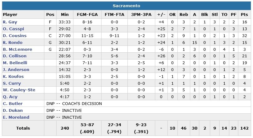 Mené de 4 points, Sacramento répond par un 12-0 dans le 3e quart-temps. Cousins et Rondo inscrivent chacun 9 points et les Kings terminent à 44 points dans le dernier quart-temps pour un avantage 103-87 avant même de jouer les 12 dernières minutes.