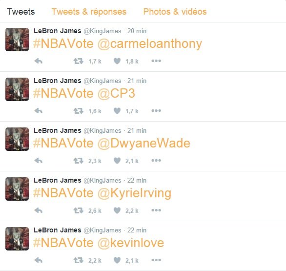 Les votes pour le All-Star Game sont encore ouverts et LeBron James vient de passer sur Twitter pour donner le sien. Un vote pas très surprenant puisqu’il a choisi deux de ses coéquipiers et ses trois amis les plus proches.