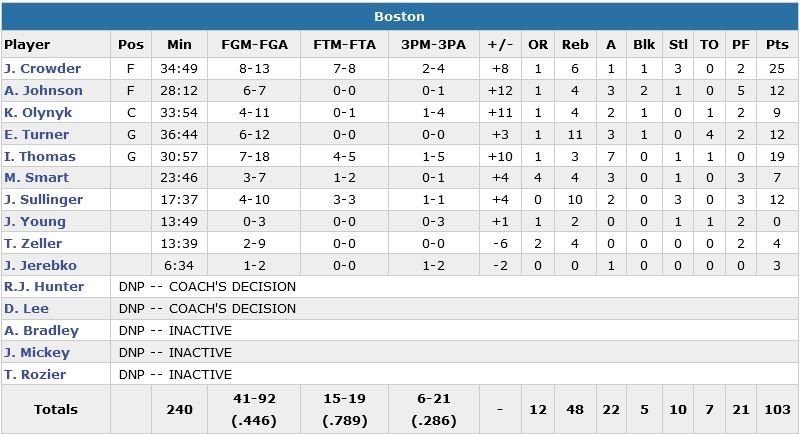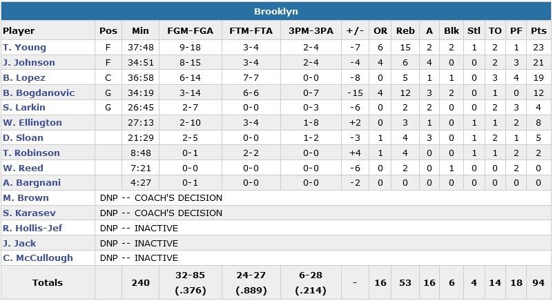 L’ailier inscrit 14 points dans le 1er quart-temps avant de se faire discret jusqu’à un 3-points et un 2+1 cruciaux après que les Nets se soient rapprochés au score dans les dernières minutes. Son précédent record était de 24 points. Il l’a battu sur 2 lancers-francs à 16 secondes de la fin du match. Isaiah Thomas ajoute lui 19 points alors qu’Evan Turner, titulaire en l’absence d’Avery Bradley (hanche) signe 12 points et 11 rebonds. Les 23 points et 15 rebonds de Thaddeus Young, 21 points de Joe Johnson et 19 de Brook Lopez ne permettent pas à Brooklyn, qui a pris un gros coup sur la tête avec la blessure de Jarrett Jack (4 points et 2 passes pour Shane Larkin hier) d’éviter une 7e défaite consécutive à domicile