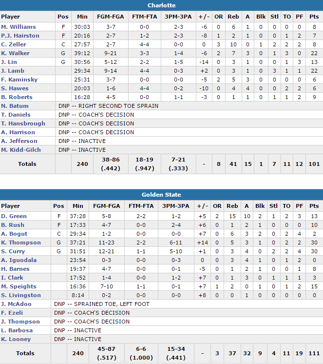 Draymond Green a signé son troisième triple-double de suite (second Warrior à le réussir avec Tom Gola en 1959-60) avec 13 points à 5/8, 15 rebonds et 10 passes alors que Curry plante 30 points à 12/21 dont 5/10 à trois points et Thompson également 30 points à 11/23 dont 6/11 à trois points. Les champions ont shooté à 51.7% dont un 15/34 à trois points et perdu seulement 11 ballons, rendant la tâche presque impossible à Charlotte, surtout que Marreese Speights s’est réveillé avec 15 points à 7/10. Les visiteurs n’ont pas fait le poids en l’absence de Nicolas Batum et Al Jefferson même si Kemba Walker (22 points à 9/21) et Jeremy Lamb (22 points à 9/14) ont fait une bonne prestation mais ne peuvent empêcher un quatrième revers de rang.