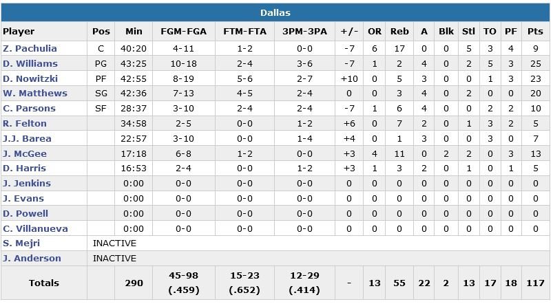 Servi par Devin Harris sur remise en jeu à 2.3 secondes de la sonnerie, Williams fait sauter Rudy Gay (en retard) sur une feinte avant de mettre dedans du corner gauche. Quelques instants plus tôt, Dirk Nowitzki (23 points à 8/19, 5 rebonds, 3 passes) avait rentré un 3-points et inscrit les 8 derniers points de son équipe, qui s’était retrouvée menée 116-109 à 1’20 de la fin de cette deuxième prolongation. En face DeMarcus Cousins (35 pts à 15/30, 17 rebs mais 10 turnovers) score au moins 30 points pour un 3e match d’affilée, dont le layup au buzzer qui permet d’égaliser à 98 partout à la fin du 4e quart-temps. Rajon Rondo n’a pas joué (dos).