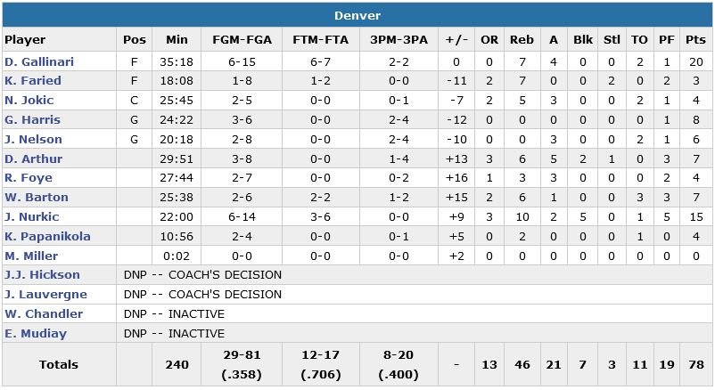 Avec 20 points à 6/15, 7 rebonds et 4 passes de Danilo Gallinari (3e match de suite à plus de 20 points), les Nuggets ont mis fin à une série de 6 défaites consécutives en l’emportant dans un match tout sauf porté sur l’attaque hier à Minneapolis, 78-74.