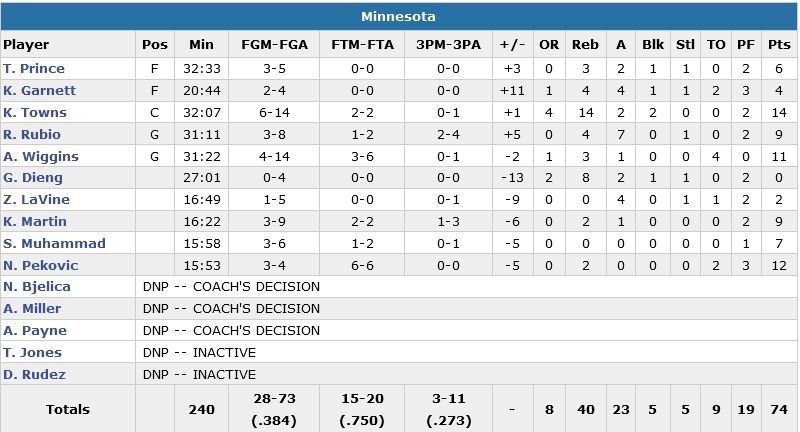 Dans cet ugly game entre les deux pires équipes de la Northwest Division, Gallinari et Nurkic sont les seuls Nuggets à atteindre les 10 points. Minnesota, qui reste sur 4 défaites de rang, mène de 10 points en début de 3e quart-temps avant que deux layups de Nurkic ne redonne l’avantage 74-69 à Denver à 7 minutes de la fin du 4e. Les Timberwolves n’avaient aucune chance de tenir en shootant à 2/20 dans les 12 dernières minutes (un seul panier dans les 11 dernières minutes du match pour eux). Andrew Wiggins (11 points à 4/14 et 3 rebonds) manque un shoot potentiellement égalisateur dans les 10 dernières secondes du match.