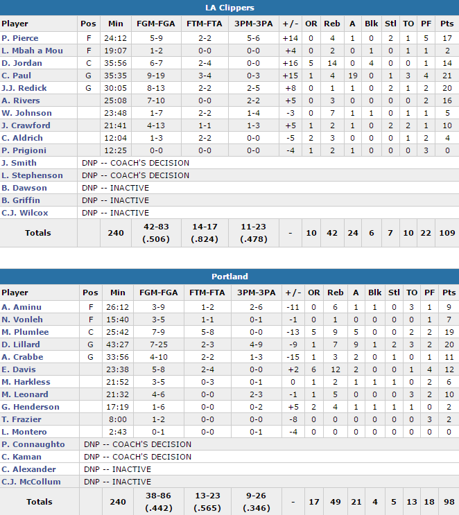 Chris Paul a sorti un gros match avec 21 points à 9/19, 4 rebonds et 19 passes décisives. JJ Redick ajoute 20 points à 8/13, Paul Pierce 17 points à 5/9, Austin Rivers 16 points à 7/10 et DeAndre Jordan 14 points à 6/7, 14 rebonds et 4 contres. Les Clippers ont shooté à 50.6% dont 11/23 à trois points et perdu seulement 10 ballons, les ingrédients pour un joli succès. En face les Blazers se sont eux privés de CJ McCollum en commettant une erreur sur la feuille de match. Damian Lillard termine avec 20 point mais à 7/25, 7 rebonds et 9 passes. Mason Plumlee compile lui 19 points à 7/9, 9 rebonds et 5 passes alors qu’Ed Davis ajoute 12 points. Portland n’a shooté qu’à 44.2% dont un 9/26 à trois points.