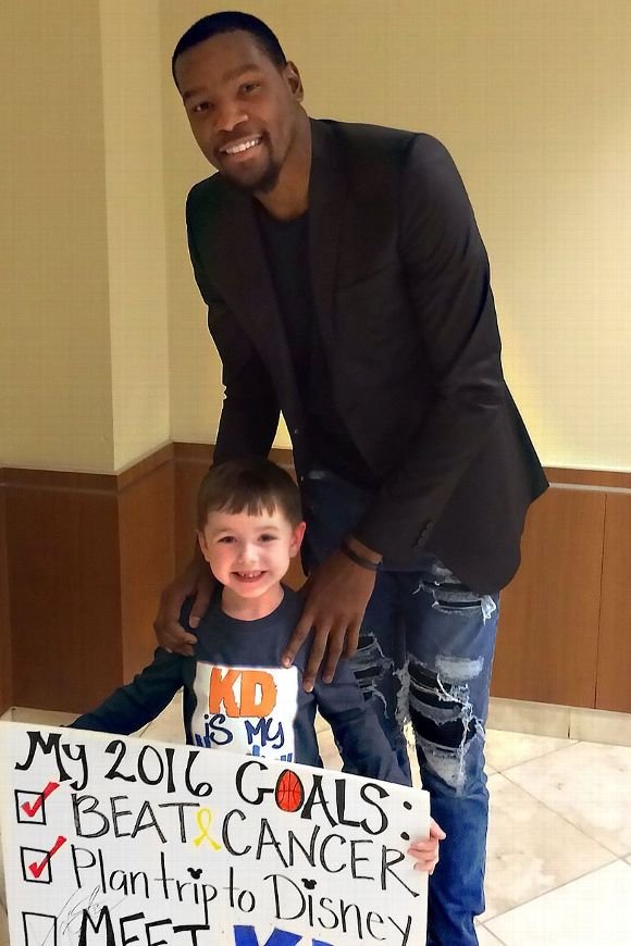 Le 27 décembre, la grande nouvelle est tombée, Keaton est guéri. Une semaine plus tard, la petite famille a fêté ça en allant voir le Thunder jouer les Kings. Sur un panneau, ses parents écrivent : « Battre le cancer, fait. Aller à Disney, fait ». Seul un objectif n’était pas encore coché: « Rencontrer KD ». Blessé, KD s’arrange pour rencontrer les Barrons à la mi-temps et lui offre ses shoes. Classe !