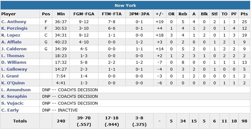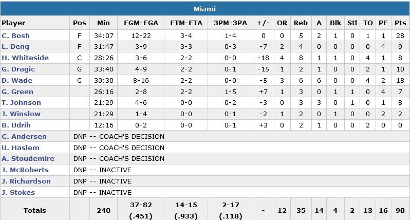 Miami n’est pas passé loin de connaître son 1er match sans le moindre 3-points en presque 4 ans. Chris Bosh inscrit 28 points à 12/22 t prend 5 rebonds, Dwyane Wade est à 18 points à 8/16, 6 rebonds et 6 passes et Hassan Whiteside (de retour après 1 match d’absence en raison d’un genou douloureux) fait peu de dégâts à l’intérieur avec 8 points à 3/6, 8 rebonds et 1 contre. Le banc des Knicks est également plus productif avec 24 points à 17 (13 points et 8 rebonds de Derrick Williams en 18 minutes). Battus de 17 et 19 points plus tôt cette saison par Miami, New York mène durant l’intégralité de la seconde mi-temps en prenant jusqu’à 15 points d’avance durant le 4e quart-temps.