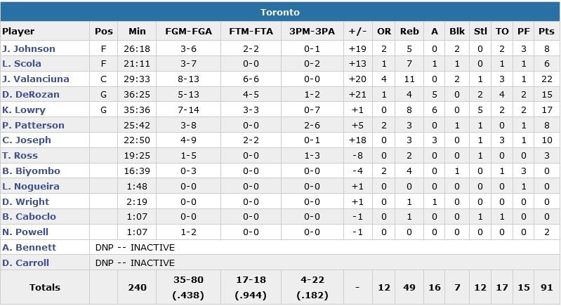 Jonas Valanciunas (22 points à 8/13, 11 rebonds et 2 contres), Kyle Lowry (17 points à 7/14 mais 0/7 à 3-points, 8 rebonds, 6 passes et 5 interceptions) et les Raptors ont infligé aux Nets une 8e défaite consécutive à domicile cette nuit, 91-74.