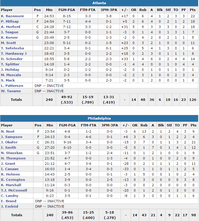 Le début de rencontre a été équilibré et les Sixers ont même mené 21-15, avant de prendre un cinglant 18-1 dans la foulée pour un avantage 36-22 des visiteurs. Mike Scott a scoré 9 points durant cette série dont un tir à trois points au buzzer du premier quart. A la pause les Hawks comptaient un matelas très confortable de 19 points. Très adroits en début de seconde mi-temps ils ont pris 24 points d’avance, avant tout à coup de lâcher un peu et d’encaisser 13 points de rang qui ont remis les Sixers dans le match avec un score de 80-69. Bazemore a alors pris les choses en mains en inscrivant 9 points et volant 2 ballons dans les dernières 3’12 du quart pour faire passer un avantage de 11 points à 21. Dennis Schröder a inscrit 10 points dans les premières 3’16 du dernier quart permettant aux Hawks de s’envoler avec 35 points d’avance.