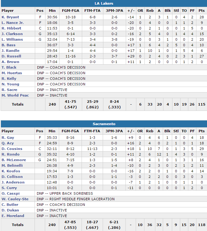 Pour son retour Kobe Bryant a tenté d’éviter une énorme déconvenue aux siens avec 28 points à 10/18 en 31 minutes, mais il n’a pas disputé la fin de rencontre. Byron Scott a en effet fait confiance aux joueurs qui ont réussi à ramener les Lakers, notamment le quatuor D’Angelo Russell (27 points à 11/16 mais sorti sur blessure à la cheville en toute fin de rencontre), Lou Williams (20 points à 7/13), Jordan Clarkson (15 points à 6/14) et Brandon Bass (10 points, 6 rebonds, 4 passes et 5 interceptions). Les Lakers ont shooté à 54.7%, mais en face les Kings ont encore fait mieux avec 55.3% ! DeMarcus Cousins signe 29 points à 8/12, 10 rebonds et 7 passes alors que Rudy Gay et Quincy Acy signent 18 points chacun et Ben McLemore 16 unités. Rajon Rondo marque 9 points dont le panier qui a mis les Kings en tête dans les dernières secondes en plus de 12 passes décisives.