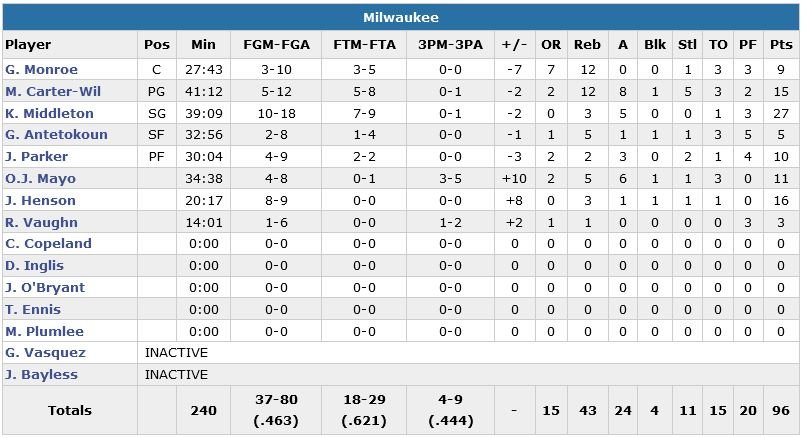 Milwaukee tient une avance de plus ou moins 10 points durant une bonne partie du 4e quart-temps jusqu’à deux 3-points consécutifs signés Raymond Felton, qui égalise à 90 partout alors qu’il reste 4’20 à jouer. Les deux équipes manquent ensuite plusieurs occasions avant une faute de Felton sur Middleton, qui rentre un lancer sur deux pour une courte avance 94-93. Nowitzki rentre deux lancers à 38 secondes pour donner un premier avantage à Dallas depuis le premier quart-temps. Mais Henson dévie ensuite une passe de l’Allemand et le ballon atterrit dans les mains de Middleton, qui fonce au cercle. Deron Willams rate au buzzer, game over.
