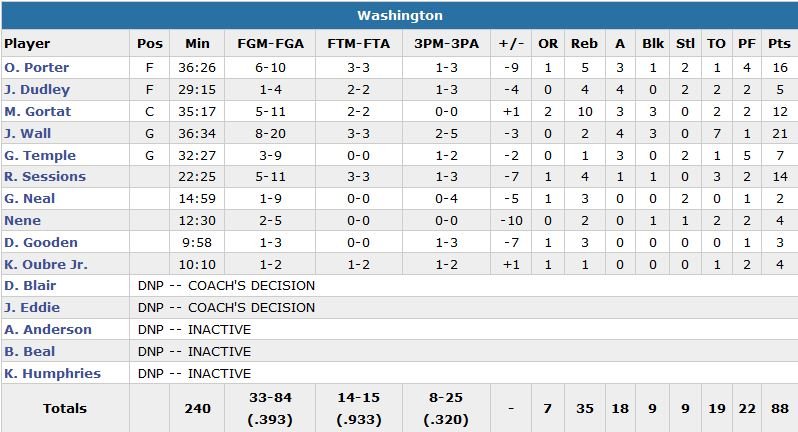 Les Raptors (menés 26-18 après 12 minutes de jeu) l’ont emporté malgré un record en saison de 23 pertes de balles, prenant le contrôle au terme d’un 18-4 qui leur permet de prendre 10 points d’avance à 2’40 de la fin du 3e quart-temps. Les Wizards ne se rapprocheront ensuite plus à moins de 6 points (89-83 à 2’50 de la fin du match).
