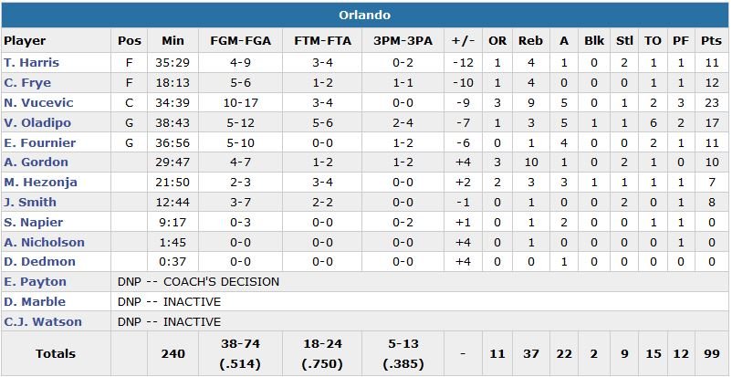 5 joueurs de Washington dépassent les 10 points dont Gary Neal en sortie de banc (16 points à 7/10) et Marcin Gortat (5/9, 10 rebonds) et Jared Dudley (16 points chacun). Orlando perd de son côté un 5e match en 6 rencontres avec 23 points et 9 rebonds de Nikola Vucevic, 17 points de Victor Oladipo mais un Evan Fournier toujours dans le dur avec 11 points à 5/10 et 4 passes.