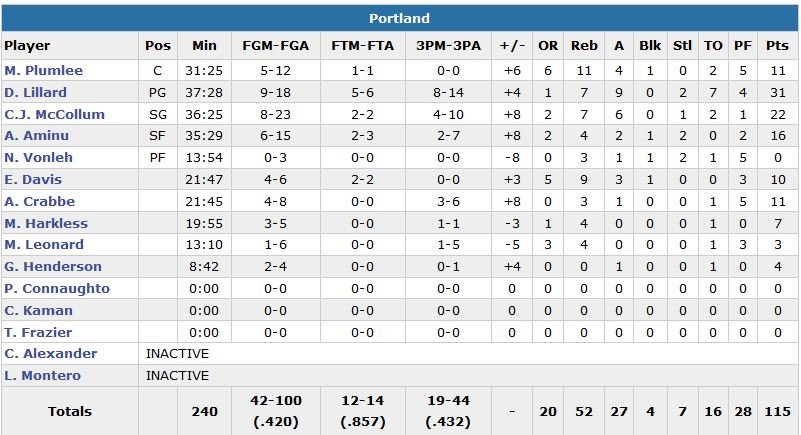 Le meneur, qui plante tout simplement 5 trois-points dans les dernières 3’07 de la rencontre (17 points en tout dans le 4e quart-temps), était accompagné par C.J. McCollum (22 points à 8/23 et 6 passes), Mason Plumlee (11 points à 5/12, 11 rebonds et 4 passes) et Al-Farouq Aminu (16 points à 6/15, 4 rebonds 2 passes) pour faire face au dangereux duo Kevin Durant (28 points à 10/23, 6 rebonds 4 passes) – Russell Westbrook (25 points à 7/19, 9 rebonds et 15 passes). Steven Adams était en double-double avec 17 points à 6/6 et 10 rebonds dans la raquette du Thunder alors que Serge Ibaka ajoute 14 points à 5/7.