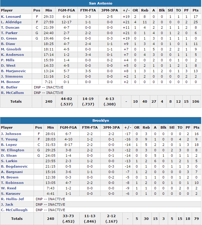 LaMarcus Aldridge a été l’homme du match avec 25 points à 12/17 et 11 rebonds en seulement 28 minutes alors que Kawhi Leonard ajoute 17 points et 8 rebonds en 30 minutes. Tout le monde a apporté sa pierre à l’édifice dont Boris Diaw avec 11 points et Boban Marjanovic avec 13. Tony Parker signe lui un petit match: 6 points à 2/7 et 4 passes mais les Texans terminent à 53.7% aux tirs contre 45.2 aux Nets. Ces derniers ont été menés par Brook Lopez (18 points à 8/17) et Joe Johnson (16 points à 6/7). Wayne Ellington et Donald Sloan ont été mis dans le 5 majeur mais ils combinent 10 points à 4/12.