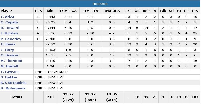 Leur domination ne dure qu’un temps face à l’avantage des Rockets au rebond, surtout offensif (42 rebonds dont 18 offensifs à 31 dont 13 offensifs). Vince Carter égalise à 83 partout sur un 2+1 à 7’35 restantes. Jones et Howard vont porter leur équipe en attaque et Houston sera limité à seulement 8 points sur le reste du match, ce qui va permettre à Houston de reprendre jusqu’à 18 points d’avance.