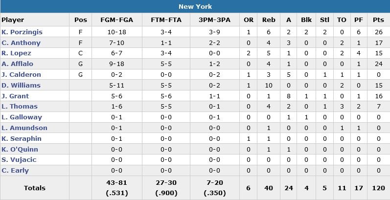 Avec 26 points à 10/18, 6 rebonds 2 passes et 2 contres de Kristaps Porzingis, 24 points dont 20 en seconde mi-temps d’Arron Afflalo, 16 dont 10 dans le 4e quart-temps de Jerian Grant (8 passes) et un Carmelo Anthony propre (17 points à 7/10, 4 rebonds et 3 passes) mais victime d’une entorse de la cheville droite juste avant la mi-temps, les Knicks ont poursuivi leur bonne série (5e victoire en 6 matchs) en s’imposant 120-114 contre Boston et en prouvant encore une fois qu’ils avaient du caractère cette nuit.