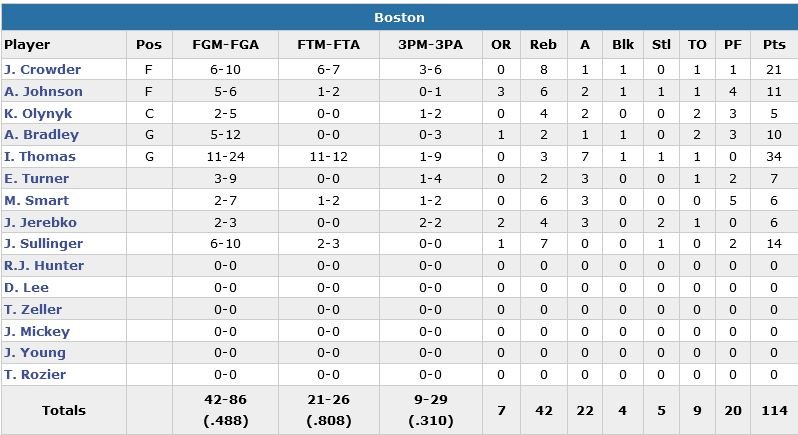 Isaiah Thomas score 34 points (11/24, 7 passes) pour les Celtics, Jae Crowder 21 (6/10, 8 rebonds) mais l’équipe perd une 4e rencontre d’affilée. New York, qui possède désormais un bilan équilibré de 20 victoires pour autant de défaites, rentre 9 de ses 11 premiers tirs et shoote à 66.7% dans le premier quart-temps, ce qui permet à l’équipe de mener largement 36-27. Devant 55-41 en fin de 2e, les Knicks perdent Carmelo Anthony, qui se tord la cheville lors d’une collision avec un arbitre. La star quitte le parquet à 1’16 du buzzer de la 1ère mi-temps puis revient jouer 19 secondes dans le 3e avant de quitter définitivement le match.
