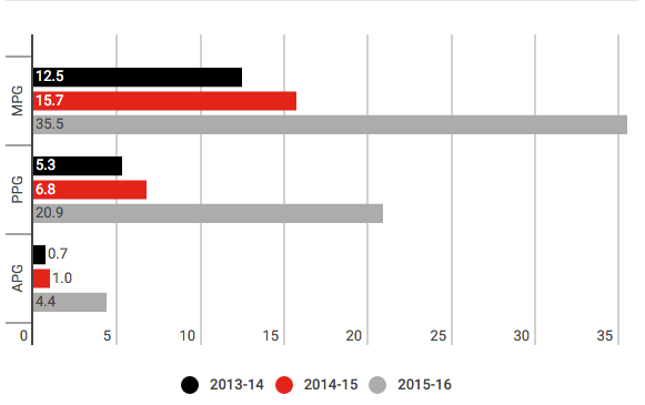 Avant de commencer, étudions rapidement les statistiques de CJ McCollum sur ses trois premières saisons NBA, grâce à ce graphique réalisé par Bleacher Report.