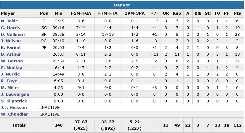 Grosse surprise au Pepsi Center cette nuit puisque Denver est devenue la 3e équipe cette saison à battre les Warriors, 112-110. Danilo Gallinari est leader des Nuggets avec 28 points à 5/14 et 17/19 aux lancers-francs tandis que Stephen Curry (9 passes, 8 ballons perdus) marque 38 points à 13/25 et 5/12 à 3-points dans la défaite des siens, qui n’avaient plus perdu depuis le 30 décembre à Dallas.