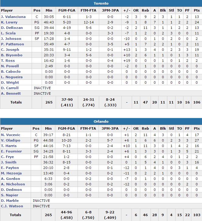 Toronto s’en sort alors que leurs deux stars Kyle Lowry (24 points à 5/20, 12/14 aux lancers, 8 rebonds et 7 passes) et DeMar DeRozan (13 points à 4/19 et 11 rebonds) ont été très maladroites, mais Cory Joseph (19 points à 9/11), Luis Scola (11 points), Patrick Patterson (11 points et 7 rebonds) et Bismack Biyombo (11 points et 6 rebonds) ont fait le boulot.