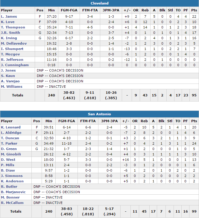 La rencontre a démarré très fort pour les Cavaliers, puisqu’ils ont pris la tête 12-2 dans le sillage d’un duo Kevin Love – Jr Smith déchaîné. Les Texans ont laissé passer l’orage et sont revenus mais Cleveland s’est instantanément échappé une nouvelle fois pour mener 26-13 puis finalement 32-20, mettant la défense des Spurs en difficulté. Ces derniers ont resserré leur défense et en second acte les Cavs ont été limités à seulement 18 unités, permettant aux locaux de recoller. Pas au mieux en attaque, ils ont décidé de s’en remettre à Tony Parker, très agressif, qui a inscrit les 12 derniers points des siens pour revenir à 44-50 à la pause.
