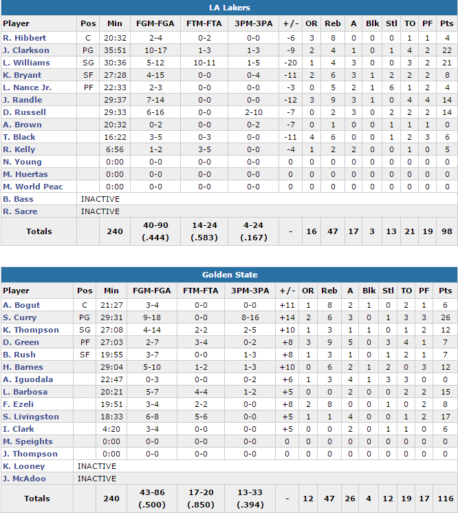 Les Warriors ont été incapables de faire le moindre mini-break en 1ère mi-temps et les deux équipes se sont suivies. A la pause Golden State était toutefois en tête 52-49. C’est au retour des vestiaires que les locaux ont fait un premier mini-break avec notamment leur réussite extérieure. Thompson et Rush ont allumé la mèche et Curry a pris le relais. Avec 5 tirs à trois points en moins de 8 minutes les Warriors ont pris 7 points d’avance, pas suffisant pourtant pour décrocher les Lakers. Russell et Randle les ont remis à 3 points à 3’40 de la fin du quart. Green, Ezeli et Curry ont alors contribué à un 11-0 qui a donné l’avantage aux hommes de Luke Walton 86-72 après trois quarts. Barbosa et Livingston ont enfoncé le clou et porté l’écart à 20 points, scellant le sort de la rencontre