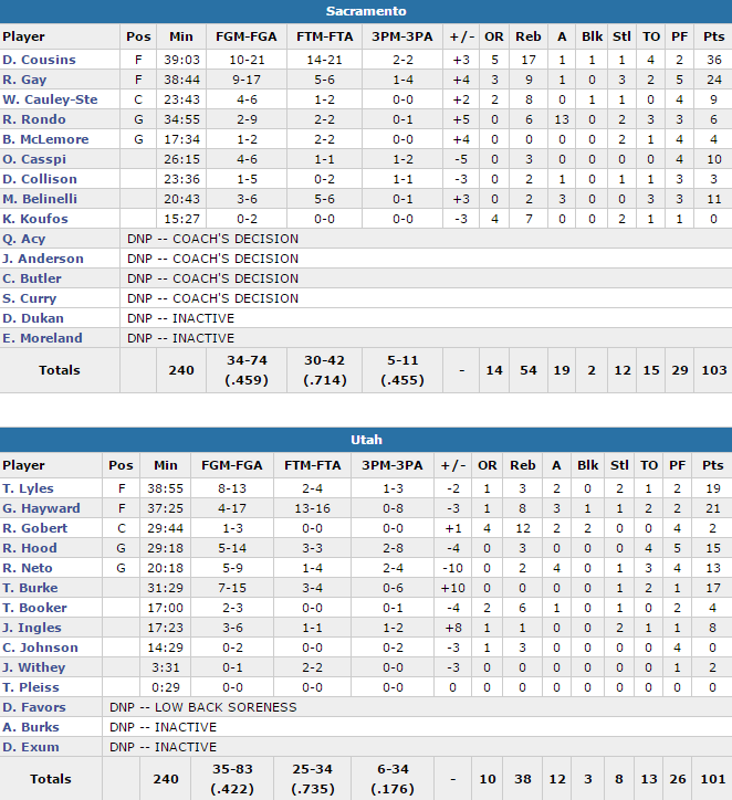 DeMarcus Cousins a sorti encore un énorme match avec 36 points à 10/21 et 17 rebonds. Rajon Rondo a lui distribué avec 6 points à 2/9 mais 13 passes. Omri Casspi ajoute 10 points et Marco Belinelli 11. En face le Jazz a été maladroit avec seulement 42.2% à l’image de Gordon Hayward, auteur de 21 points mais à 4/17, ou encore Rodney Hood, qui inscrit 17 points mais à 5/14. Trey Burke termine lui avec 17 points à 7/15 et Rudy Gobert signe 2 points à 1/3, 12 rebonds et 2 contres.