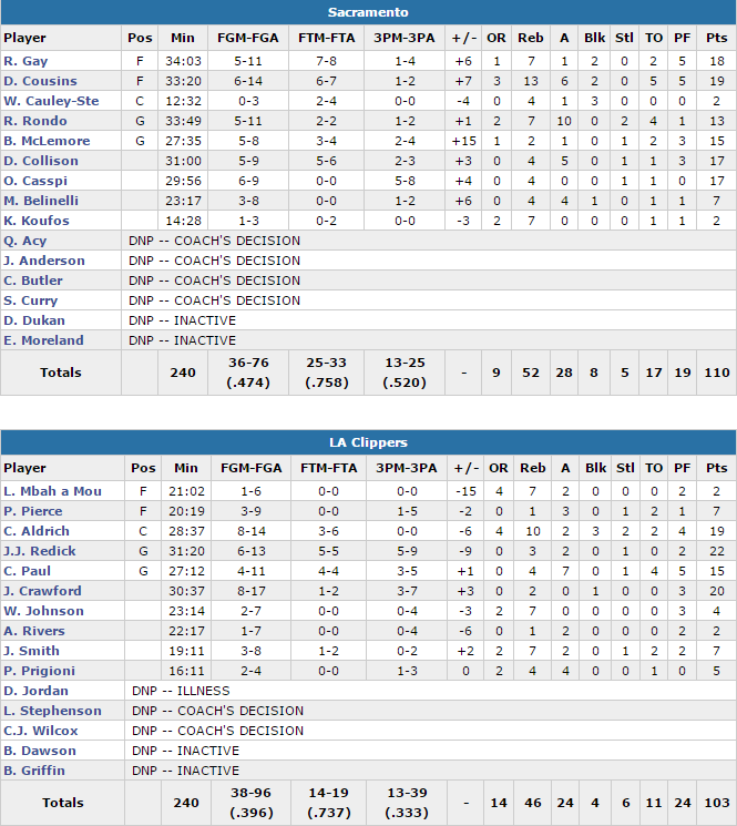 DeMarcus Cousins signe 19 points à 6/14, 13 rebonds et 6 passes pour mener 5 autres joueurs des Kings à au moins 13 points. Rudy Gay ajoute 18 points à 5/11 et 7 rebonds, Darren Collison et Omri Casspi sortent du banc pour inscrire 17 points chacun dont un 5/8 à trois points pour l’Israélien. Rajon Rondo compile lui 13 points, 7 rebonds et 10 passes. Les Kings shootent à 47.4% et surtout à un excellent 13/25 derrière l’arc, bien mieux que les Clippers, limités à seulement 39.6%. Privés de DeAndre Jordan et Blake Griffin, les Clippers ont été menés par le quatuor JJ Redick (22 points à 6/13), Jamal Crawford (20 points à 8/17), Cole Aldrich (19 points à 8/14 et 10 rebonds) et Chris Paul (15 points à 4/11 et 7 passes). Le reste de l’équipe a été très maladroit et cela a finalement coûté le match aux hommes de Doc Rivers.