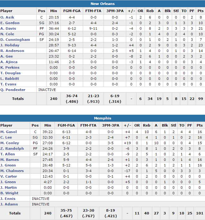 Pas moins de 4 Grizzlies inscrivent 16 points: Marc Gasol, Courntey Lee, Matt Barnes et Jeff Green, alors que Mike Conley compile lui 15 points et 10 passes. C’est toutefois en défense qu’ils ont réussi à faire la différence en dernier quart et ensuite résisté grâce à leur adresse extérieure (8/19). En face les Pelicans ont été menés par le trio Anthony Davis (21 points à 6/12 et 8r ebonds), Jrue Holiday (23 points à 9/13 et 9 passes) et Ryan Anderson (14 points à 6/14), mais ils ont fini par craquer en dernier acte, incapables de trouver des solutions pendant plusieurs minutes.