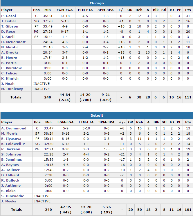 Pau Gasol est l’homme de la rencontre avec 31 points à 13/18 et 12 rebonds. L’Espagnol a posé d’énormes soucis à une défense des Pistons pas au niveau, qui a laissé Chicago shooter à 52.4%. Derrick Rose a été excellent avec 20 points à 9/17 alors que Jimmy Butler ajoute 16 points à 5/13 et 9 passes. Doug McDermott sort aussi un bon match en sortie de banc avec 11 points. Très maladroits à trois points avec un 5/26, Detroit a eu un passage à vide fatal en dernier acte. Reggie Jackson signe 19 points à 8/20, tout comme Ersan Ilyasova (19 points à 8/16 et 11 rebonds). Andre Drummond a lui été bien plus discret avec 13 points à 5/9, 3/10 aux lancers et 16 rebonds. Kentavious Caldwell-Pope n’a lui pas fini le match, expulsé pour deux fautes techniques.