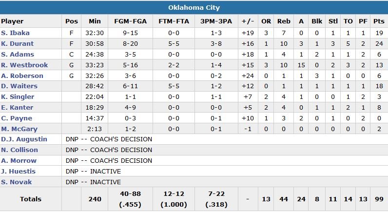 Devant 44-42 à la mi-temps derrière 15 points et 9 rebonds de Durant (18 points de Wade, son record en une mi-temps cette saison), Oklahoma City va faire la différence à partir du 3e quart-temps, remporté 31-16. À 49-48, le Thunder se détache sur un 8-0 comprenant 3 paniers d’Andre Roberson. Puis Durant, Serge Ibaka (19 points à 9/15 et 7 rebonds) et Westbrook rentre chacun un 3-points pour permettre à OKC de prendre 16 longueurs d’avance (66-50) avant de garder le contrôle jusqu’au bout.
