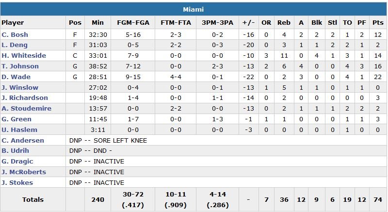 Au repos vendredi contre Denver, Dwyane Wade était de retour et a terminé à 22 points à 9/15, 2 rebonds et 3 passes pour son 34e anniversaire. Hassan Whiteside compile de son côté 14 points, 11 rebonds et 4 contres. Miami perd un 4e match en 5 rencontres n’avait jamais aussi peu scoré dans un match cette saison avant ce déplacement à la Chesapeake Energy Arena. Leader de l’équipe au scoring cette saison, Chris Bosh a été tenu à 12 points à 5/16 (4 rebonds, 2 passes, 2 contres, 2 interceptions).