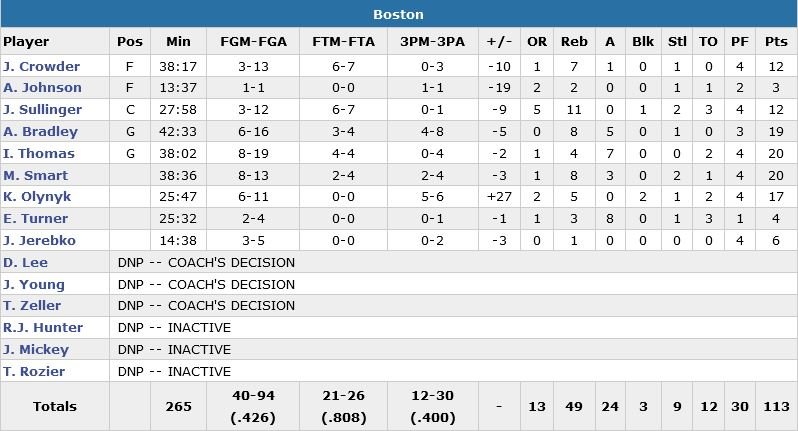 À noter : Nowitzki score 14 points dans le 4e et 7 en prolongation. Isaiah Thomas et Marcus Smart terminent meilleurs marqueurs des Celtics avec 20 points chacun, Avery Bradley suit avec 19 points.